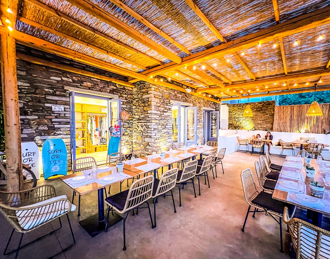 Delicious appetizers and fresh salads are the perfect starters for a unique culinary experience. Local meats and fish will enhance your lunch or dinner. Finally, the right wine or drink will be the best “finale” in this unique restaurant in Andros. At Wesurfin we do not forget the local recipes and the history of our place. That is why we try to combine yesterday and today in the best way, serving tradition on your plate. At the same time, next to the restaurant, you will find the surfing club and the Beach Bar.